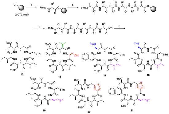 Solid-phase peptide synthesis of 15–21 on 2-chlorotrityl chloride (2-CTC) resin. Reagents and conditions: (a) Fmoc-AA-OH (or Fmoc-Thz-OH in the synthesis of 20 and 21), DIPEA, and DCM (r.t., 1 h, capped with MeOH, r.t., 0.5 h); (b) 1. deprotection: 20% piperidine/DMF (r.t., 2 × 5 min followed by 1 × 10 min); 2. coupling: Fmoc-AA-OH, HOAt, DIC, and DMF (r.t., 2 h); 3. steps 1–2 repeated; (c) cleavage: four treatments with 1% TFA/DCM (r.t., 3 min); (d) macrocyclization: (concentration of 1–5 mM) HBTU, DIPEA, DMAP, and DCM (r.t., 3–5 days; cyclization yields: 59% (15), 55% (16), 48% (17), 66% (18), 54% (19), 83% (20), and 40% (21)).