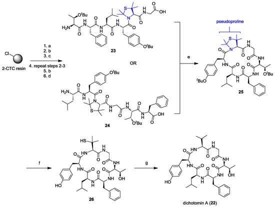 Solid-phase peptide synthesis of dichotomin A (22) on 2-chlorotrityl chloride (2-CTC) resin. Reagents and conditions: (a) 1. Fmoc-Gly-OH (for 23) or Fmoc-Phe-OH (for 24), DIPEA, and DCM; 2. DCM/MeOH/DIPEA (17:2:1); (b) 10% piperidine/DMF; (c) Fmoc-AA-OH, HBTU, DIPEA, and NMP; (d) 20% HFIP/DCM; (e) (concentration of 1 mM) DMTMM·BF4, DIPEA, and DMF (r.t., 3 h; yield of 25: 84% from 23 and 87% from 24)); (f) TFMSA/water (2:1) (r.t., 4 h, 33%); (g) NiCl2, NaBH4, and MeOH (0 °C, 0.5 h, 24%).