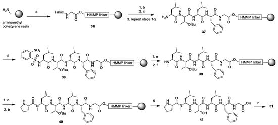 The SPPS of native cyclohexapeptide dianthin G (29) was reported previously [43] but was later adapted for the synthesis of methylated analogues 31–34 (Scheme 7). The Nα-methylated derivatives 31–34 were synthesized from aminomethyl polystyrene resin and the 3-(4-hydroxymethylphenoxy)propionic acid) (HMPP) linker; however, the synthesis of 35 required the use of a more hindered 2-CTC resin to prevent the formation of undesired diketopiperazine by-products [42]. A representative synthesis of cyclohexapeptide 31 is shown in Scheme 7. The aminomethyl polystyrene resin was first loaded with Fmoc-Gly-HMPP-OH to form 36. The solid-supported linear pentapeptide 37 was constructed on-resin using classical SPPS. The terminal amino function was activated by reacting with 2-nitrobenzenesulfonyl chloride to form 38, followed by methylation and deprotection to afford 39. After attaching the final proline residue, hexapeptide 40 was cleaved from the resin to form 41, which was cyclized using HBTU-mediated solution-phase cyclization to afford 31.