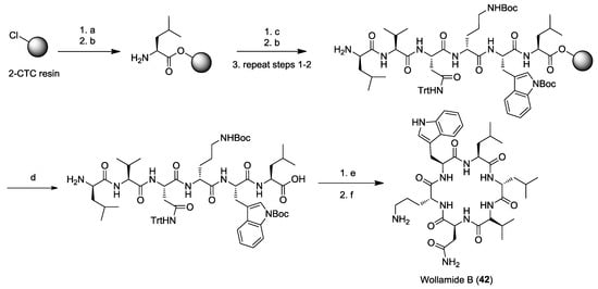 In 2017, Asfaw et al. reported the synthesis of cyclohexapeptide wollamide B (42) and 24 of its analogues [44]. The Fmoc-based SPPS of a linear hexapeptide precursor was followed by solution-phase macrocyclization and cleavage of protecting groups, as described in Scheme 8. The first amino acid (Fmoc-Leu-OH) was loaded onto 2-CTC resin by using DIPEA/DCM followed by capping with methanol. HATU and DIPEA in NMP were used during the coupling steps to elongate the peptides. The N-terminal Fmoc group was deprotected after each round of coupling using 20% piperidine in DMF. The resin was treated with 20% HFIP in DCM to complete cleavage of the linear hexapeptide precursors. Macrocyclization was done using HATU, hydroxybenzotriazole (HOBt), and DIPEA in DMF to produce a crude cyclic hexapeptide that was then purified via column chromatography. Lastly, the Trt and Boc side-chain protecting groups were removed using a TFA/triisopropylsilane (TIPS)/H2O solution (95/2.5/2.5) to afford wollamide B (47) in 91% yield after purification by silica gel chromatography.