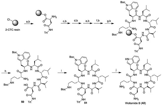 Solid-phase peptide synthesis of 42 on 2-chlorotrityl chloride (2-CTC) resin. Reagents and conditions: (a) Fmoc-Asn(Trt)-OH, DIPEA, and DCM (r.t., 3 h); (b) 25% 4-methylpiperidine/DMF; (c) Fmoc-Val-OH, DIC, HOBt, and DMF/DCM (1:1) (r.t., 4 h); (d) Fmoc-D-Leu-OH, DIC, HOBt, and DMF/DCM (1:1) (r.t., 4 h); (e) Fmoc-Leu-OH, DIC, HOBt, and DMF/DCM (1:1) (r.t., 4 h); (f) Fmoc-Trp(Boc)-OH, DIC, HOBt, and DMF/DCM (1:1) (r.t., 4 h); (g) Fmoc-D-Orn(Boc)-OH, DIC, HOBt, and DMF/DCM (1:1) (r.t., 4 h); (h) HFIP/DCM (1:4) (r.t., 0.5 h); (i) (concentration of 1 mM) HBTU, DIPEA, and DMF (r.t., 0.5 h; cyclization yield of 51: 72%); (j) TFA/TIPS/DCM (50:5:45) (r.t., 0.5 h, 42%).