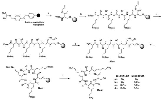 In 2016, Jikyo reported the synthesis of cyclic hexapeptides 65a–d using an on-resin head-to-tail cyclization strategy on trichloroacetimidate Wang resin (Scheme 12) [48]. The D-Ser side chain of Fmoc-D-Ser-OAll was anchored to the trichloroacetimidate Wang resin using BF3·OEt2 in dry TFA. Iterative coupling and deprotection steps using BOP/HOBt/DIPEA and 20% piperidine/DMF, respectively, for five cycles constructed resin-bound linear hexapeptide intermediates having Fmoc/Boc/OAll protecting groups intact. Pd(PPh3)4 in CHCl3/AcOH/N-methylmorpholine (NMM) was used under anhydrous conditions to complete C-terminal O-allyl deprotection before the addition of 20% piperidine in DMF to remove N-terminal Fmoc, which afforded anchored linear peptides 63a–d having deprotected C- and N-terminals. On-resin cyclization to afford 64a–d was achieved with PyBOP/HOBt/DIPEA as the coupling agent, and cleavage from the resin using 95% TFA resulted in cyclohexapeptides 65a–d in 13–63% yields. Interestingly, on-resin cyclization of 64c, having two D-Pro residues in the chain, gave the highest yield of cyclized product 65c with a yield of 63%.