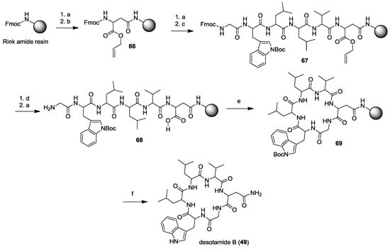 In 2018, Chen et al. reported the synthesis and antibacterial evaluation of cyclohexapeptides desotamide B (49) and wollamide B (42) in addition to a series of their structural analogues by utilizing an on-resin head-to-tail cyclization strategy (Scheme 13) [49]. Fmoc-Asp-OAll was first anchored to the Rink Amide AM resin through the use of the coupling reagent O-(1H-6-chlorobenzotriazole-1-yl)-1,1,3,3-tetramethyluronium hexafluorophosphate (HCTU)/DIPEA to form the resin-bond amino acid 66. SPPS was used to form the linear peptide 67, which contained different Fmoc protected amino acids. The allyl group was uncapped with Pd(PPh3)4 and phenylsilane. The N-terminal amino group was then released by using a treatment of 20% piperidine/DMF to form the linear peptide precursor 68. The on-resin cyclization step included treatment with (7-azabenzotriazol-1-yloxy)tripyrrolidinophosphonium hexafluorophosphate (PyAOP)/HOAt/NMM in NMP for 12 h to produce the protected cyclohexapeptide 69 on-resin. The target cyclohexapeptides were produced after final cleavage and global deprotection with TFA/phenol/water/TIPS (88:5:5:2, v/v/v/v).