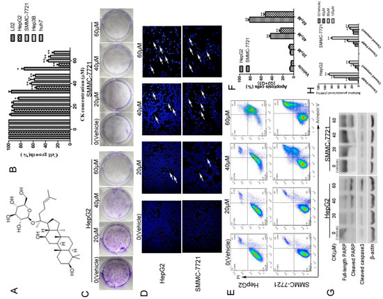 CK inhibited the growth of HepG2 and SMMC-7721 cells by inducing apoptosis. (A) Chemical structure of CK. (B) HepG2, SMMC-7721, Hep3B, Huh7 and L02 cells were treated with 0, 20, 40, and 60 μM CK for 48 h, and cell viability was measured by the MTT assay; Statistics were done by one-way ANOVA and Dunnett text. * p < 0.05, ** p < 0.01 vs. Vehicle. (C) HepG2 and SMMC-7721 cells were treated with 0, 20, 40, and 60 μM CK for 48 h, and then the cells were cultured in fresh medium for another 7 d. Colonies were stained with crystal violet and imaged. (D) HepG2 and SMMC-7721 cells were stained with Hoechst and observed by fluorescence microscopy (200× magnification). (E) Apoptotic cells were assessed by flow cytometry following Annexin V/PI staining. (F) Quantitative analysis of the data from (E) to give the percent of apoptosis cells by flow cytometry. Results are shown as mean ± SD; Statistics were done by one-way ANOVA and Dunnett text. * p < 0.05, ** p < 0.01 vs. Vehicle. (G) HepG2 and SMMC-7721 cells were treated with CK (0, 20, 40, and 60 μΜ) for 48 h, and cleaved caspase 3 and PARP were detected by western blotting. (H) Quantification of the data in (G). Cleaved caspase 3 and cleaved PARP levels were determined relative to β-actin. Data are presented as mean ± SD; Statistics were done by one-way ANOVA and Dunnett text. * p < 0.05, ** p < 0.01 vs. Vehicle.