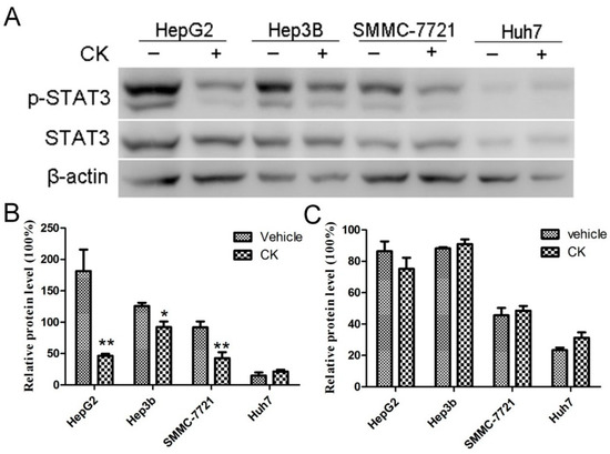 2.2. CK Downregulated p-STAT3 Levels in Different HCC Cell Lines