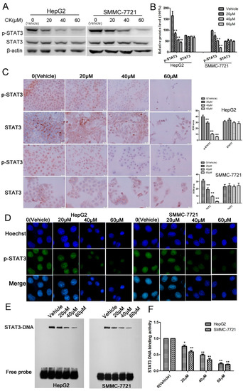 CK inhibited p-STAT3 activity in HepG2 and SMMC-7721 cells. (A) HepG2 and SMMC-7721 cells were treated with CK (0, 20, 40, and 60 µΜ) for 48 h, and STAT3 and p-STAT3 levels were detected by western blot. (B) Quantification of the western blot data in (A) relative to β-actin. Data are presented as mean ± SD; Statistics were done by one-way ANOVA and Dunnett text. * p < 0.05, ** p < 0.01 vs. Vehicle. (C) Immunocytochemistry of STAT3 and p-STAT3 in HepG2 and SMMC-7721 cells after CK treatment (400× magnification). Data analysis is calculated by ImagePro-Plus software. Statistics were done by one-way ANOVA and Dunnett text. * p < 0.05, ** p < 0.01 vs. Vehicle. (D) Immunofluorescence was performed to further clarify p-STAT3 localization. (E) EMSA to determine the STAT3 DNA-binding activity after CK treatment in HepG2 and SMMC-7721 cells. (F) Quantification of the EMSA results in (E) using Image Quant software (Amersham). Data are presented as mean ± SD of three measurements; Statistics were done by one-way ANOVA and Dunnett text. * p < 0.05, ** p < 0.01 vs. Vehicle.