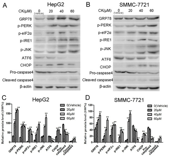 Previous studies have reported that ERS plays an important role in the apoptosis induced by Saponin compounds [27]. In our study, the expression of GRP78 and CHOP (signature ERS markers) were upregulated following CK treatment in HepG2 and SMMC-7721 cells. Additionally, the three UPR signaling pathways were also active. As shown in Figure 4A,B, CK significantly increased levels of phosphorylated (p)-PERK (Thr980), p-eIF2α (Ser51), p-IRE1 (S724) and p-JNK (Thr183/Tyr185), illustrating activation of the PERK and IRE1 pathways. Furthermore, ATF6 levels were diminished, as it presumably translocated to the Golgi where it was cleaved (Figure 4A,B). Meanwhile, levels of pro-caspase4 were markedly decreased, while cleaved caspase4 levels increased with CK treatment (Figure 4C,D). Collectively, these results revealed that CK induced ERS in HepG2 and SMMC-7721 cells.