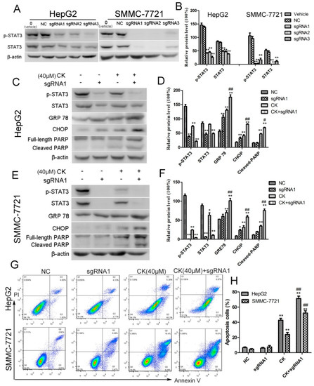 To investigate whether inhibiting STAT3 mediated ERS and apoptosis following CK treatment, we knocked out STAT3 using CRISPR/Cas9 technology. Three small guide RNAs (sgRNAs) were designed against targets within STAT3 and their efficiencies were tested in HepG2 and SMMC-7721 cells. As shown in Figure 5A,B, STAT3 and p-STAT3 levels were inhibited by all three sgRNAs. We chose sgRNA1 (5′-CTGCTGCTTCTCCGTCACCA-3′) to conduct the further experiments. The results showed that silencing STAT3 significantly upregulated the ERS signature proteins GRP78 and CHOP in response to CK (Figure 5C–F). Meanwhile, cleaved PARP levels also increased with CK treatment in STAT3-sgRNA1-transfected HepG2 and SMMC-7721 cells (Figure 5C–F). Furthermore, flow cytometry results showed that inhibiting p-STAT3 significantly increased the proportion of apoptotic cells in STAT3-sgRNA1-transfected cells following CK treatment comparing to CK group. (Figure 5G,H). Taken together, blocking STAT3 activation enhanced ERS and apoptosis in CK-treated HepG2 and SMMC-7721 cells.