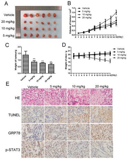 Based on the pharmacological effects of CK in vitro, we injected SMMC-7721 cells into nude mice to investigate the in vivo antitumor activity of CK. When tumors had reached approximately 50–100 mm3, the mice were treated with normal saline (vehicle) or 5, 10, and 20 mg/kg CK. The results showed that CK inhibited tumor growth in mice; the tumor inhibition rates were 38.64%, 44.01% and 51.79% for 5, 10 and 20 mg/kg CK, respectively (Figure 6A). Compared with vehicle controls, tumor weights and volumes were significantly reduced following CK treatment (Figure 6B,C). However, there are not significant differences of tumor volumes between the CK treatment groups. Additionally, there were no significant differences in body weight among the vehicle and 5 and 10 mg/kg CK-treated groups (Figure 6D). Furthermore, hematoxylin and eosin (HE) staining and TUNEL (TdT-mediated dUTP Nick-End Labeling) assays showed that necrotic and apoptotic cells in the tumor tissues were significantly increased following CK treatment compared with the vehicle group (Figure 6E). Meanwhile, immunohistochemical (IHC) staining showed that CK treatment upregulated GRP78 expression and downregulated p-STAT3 levels (Figure 6E). Taken together, CK inhibited tumor growth and induced apoptosis in vivo, activities that might be related to regulating STAT3 and ERS in HCC cells.