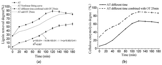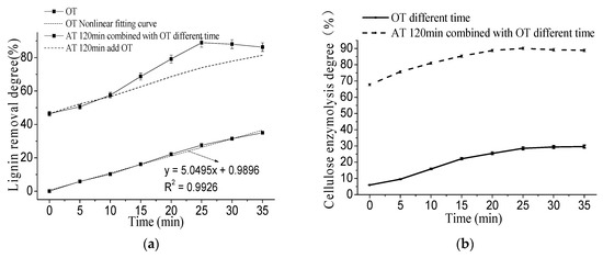 The effect of NaOH treatment on the removal rate of lignin of corn stover is shown in Figure 1. The removal rate of lignin increased with the treatment time with alkaline treatment (AT) alone, and its nonlinear fitting showed that R2 = 0.957, indicating that the fitting equation can well predict the change of lignin content with time in alkali treatment alone. The cellulose enzymolysis degree increased first and then decreased with the time of alkali treatment alone, indicating that the removal of lignin in the stover during this treatment stage was not the only factor limiting the enzymatic hydrolysis of cellulose. With the extension of processing time, the removal rate of lignin in stover treated with alkali treatment at different times combined with ozone treatment (OT) increased first and then decreased. The maximum lignin removal rate was 88.92% when treated with alkali for 120 min combined with ozone treatment for 25 min. When the treatment time was further extended, the lignin removal rate decreased, which was consistent with the changing trend of cellulose digestion. The reason may be that the long-term treatment of NaOH at high temperature will lead to the exposure of free hydrogen bonds in cellulose, thereby increasing the affinity with water and accumulating stover particles agglomerates. Therefore, the reaction area between stover and ozone was reduced, which affected the lignin removal effect during the ozone pretreatment and subsequent enzymolysis effect.