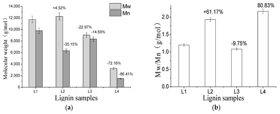 The average molecular weight (Mw), number average (Mn), and polydispersity (Mw/Mn) of the lignin samples were determined by GPC (Agilent, Palo Alto, CA, USA). The lignin samples were dissolved in 1 mL tetrahydrofuran solution. Sample solutions were syringe filtered through 0.22 μm nylon filters prior to analysis. The GPC configuration was as follows: column, Plgel Mixed-D (300 × 7.5 mm, Agilent, Palo Alto, CA, USA); eluent: chromatographically pure THF; flow rate: 1 mL/min; injection volume: 20 μL. The gel column, which measured the average molecular mass of the lignin sample, was always at a constant outside temperature.