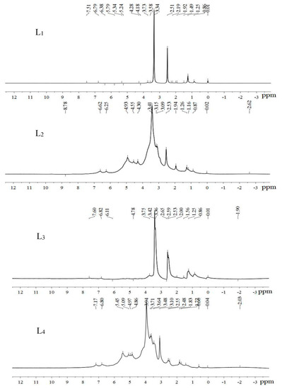 1H-NMR spectra of lignin obtained in the residue after different pretreatment of corn stover. Note: L1 (untreated stover lignin), L2 (alkaline treated stover lignin), L3 (ozone treated stover lignin), L4 (alkaline combined with ozone treated stover lignin).