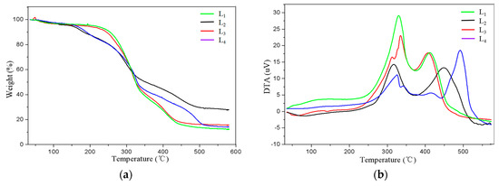 Thermo gravimetric analysis (TGA) (a) and differential thermal gravity analysis (DTA) (b) curves of lignin obtained in the residue of different pretreatment of corn stover. Note: L1 (untreated stover lignin), L2 (alkaline treated stover lignin), L3 (ozone treated stover lignin), L4 (alkaline combined with ozone treated stover lignin).