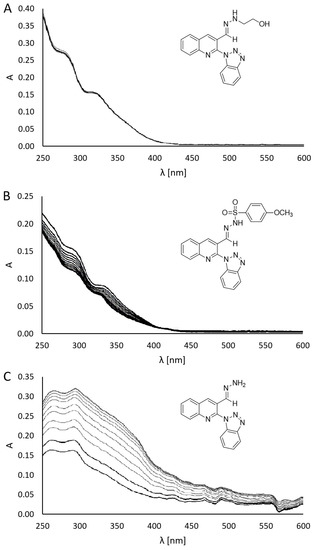 On the other hand, the time-dependent changes in the UV-Vis spectra of the hydrazones showed that precipitation of the derivatives 4e, 5a, 8f, and 9f is rather fast as exemplified by 2-(1H-benzotriazol-1-yl)-3-(hydrazonomethyl)quinoline (5a, Figure 4C). Therefore, those poorly soluble species were excluded from a panel of compounds subjected to biological studies.
