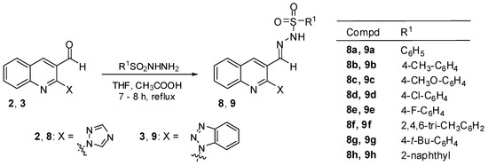 Next, we synthesized the quinoline-3-carbaldehyde N′-sulfonylhydrazone derivatives 8a–h and 9a–h (Series 3, Scheme 4). The reactions of aldehydes 2 and 3 with arylsulfonylhydrazides proceeded smoothly in THF solution under reflux in the presence of a catalytic amount of acetic acid. The identity of the newly prepared compounds was confirmed by elemental analyses as well as the IR and NMR spectroscopic data presented in the experimental section (see Section 3).