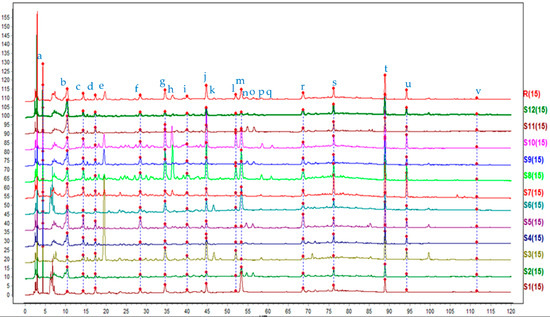 Twelve batches of samples from different origins (Table 1) were determined and the chromatograms were analyzed by SES to generate a common pattern R (Figure 1). Peak a, b, c, d, f, g, i, j, l, m, r, s, t, u and v were common peaks, and their peak areas are listed in the Supplementary Materials. The SES software was used to calculate the similarities of different chromatograms compared to the common pattern. All these results are shown in Table 2.