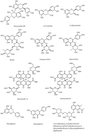 - Bahorun, T.; Neergheen, V.S.; Aruoma, O.I. Phytochemical constituents of Cassia fistula. Afr. J. Biotechnol. 2005, 4, 1530–1540. [Google Scholar] [CrossRef]