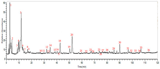 Total ion chromatogram of the fruit of C. fistula in negative-ionization mode.