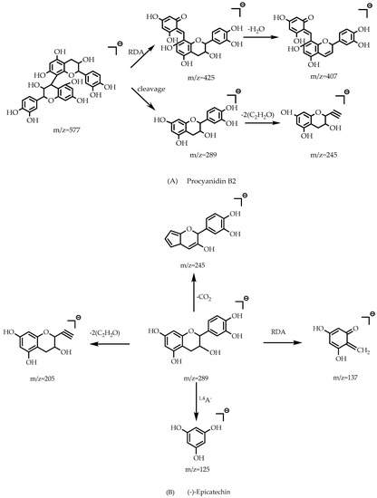 Procyanidins are a type of polymers consisting of a flavane-3-alcohol monomer as the basic unit. Among them, type B procyanidins are the most widely distributed. Compound 5 was provisionally assigned as procyanidin B2 due to its parent ion [M − H]− at m/z 577 and predominant daughter ions at m/z 425 and 407 because of a RDA cleavage, and at m/z 289 and 245, indicating the loss of procyanidin B2 in agreement with its MS/MS data of the known compound from the literature. Figure 5A shows the RDA cleavage and binding sites of procyanidin B2 [26].
