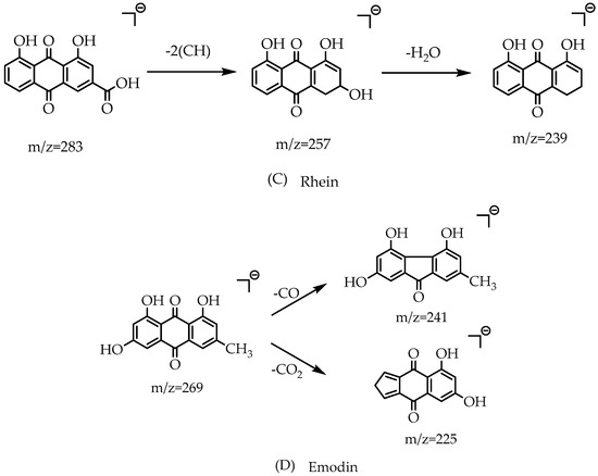 Free anthraquinones are typical of anthraquinones, and the following five free anthraquinones are the most common: rhein, emodin, chrysophanic acid, aloe emodin, physcion. Rhein and emodin were inferred to exist after comparing these compounds with the literature. Compound 30 was tentatively identified as rhein because of its parent ion [M − H]− at m/z 283 and daughter ion at m/z 257 and the other one at m/z 239. According to the prediction of the mass spectrometry, the fragment ion at m/z 257 should lose a group with a mass of about 26 from the quasi-molecular ion, but there was no a mass of approximately 26 in this system. The analysis showed it should be a system where the carboxyl of the quasi-molecular ion system lost a CO-neutral small molecule with a mass number of 28, but it was also affected by the H radical in the ion trap. One of the H radicals combined with its oxygen atom to form a hydroxyl at the cleavage site of losing a CO molecule, and the other H radical combined with its adjacent carbon at the cleavage site to form a m/z 257 fragment ion. The formation of m/z 239 fragment ion was due to that the formed hydroxyl underwent a dehydration reaction with the H in its ortho position. Compound 33 was deduced as emodin due to its [M − H]− ion at m/z 269 and the diagnostic ion at m/z 241 which underwent a loss of CO radical, and m/z 225 from losing a molecule of CO2. Compound 31 was tentatively assigned as 1-O-methylchrysophanol because of the deprotonated ion [M − H]− at m/z 269 and the fragment ions at m/z 254 and 226 due to the similarity with the spectral library data. Figure 5C,D show the RDA cleavage and binding sites of rhein and emodin respectively [27]. Compound 25 can be considered as 1,3,8-trihydroxy-6-methoxyanthraquinone in view of its [M − H]− at m/z 285 and daughter ions at m/z 270 and 241 through analyzing its molecular structure.