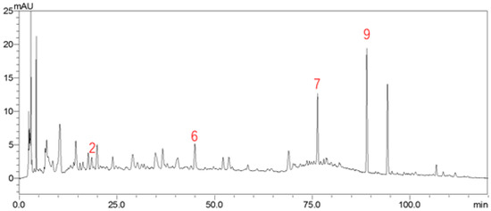 To accurately confirm more components, the following compounds were compared with standard materials: (+)-catechin, (−)-epicatechin, rutin, sennoside B, quercitrin, sennoside A, naringenin, kaempferol, rhein and emodin (Figure 6). Since these compounds were reported several times to have biological activities, they were quantified by means of chromatography. Comparing the chromatogram of the medicinal material with that of these standard materials, separation and tailing of four compounds, (−)-epicatechin (2), sennoside A (6), naringenin (7), and rhein (9), met the requirements, so they can be used as quantitative indicators. This method provided the basis for establishing its quality standards, and the result is shown in Figure 7.