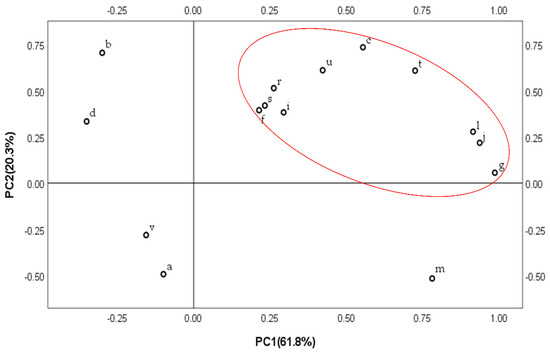 The factor loads can reflect the contribution of every index to the principal component. The sign of the factor load indicated the effect of each index on the change of the principal component value. According to the results it can be seen that peaks g, j and l had a significant positive phase load in the first principal component, indicating that the value of the first principal component increases as the three peaks increase, and peaks a, b, d and v had an inverse load in the first principal component; Peaks b and c with positive phase load were the relatively main determinants, and peaks a, m and v had a relative inverse load in the second principal component. The loading plots of the PCA model can explain the contribution of variables to each principal component. Most of the compounds were comparatively clustered together, and five compounds were outliers that were responsible for the significant differences in these medicinal materials from different places. Combination of the factor loading matrix and loading plots indicated that the main components responsible for the separation were C12H22O11 (disaccharide, peak a), C17H30O12 (peak b), C27H30O15 (peak d), C26H28O14 (peak m) and C15H22O2 (peak v) which contributed most to the grouping result. These five compounds were much more statistically significant in chemotaxonomy than the other identified components, and the higher concentration of them may be due to the good quality of the fruit of C. fistula.
