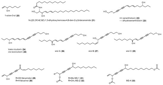 Uwai et al. isolated five polyacetylenes, cicutoxin (24), isocicutoxin (25), virol A (26), B (27) and C (28) from water hemlock (Cicuta virosa) [37]. A radioligand binding study using [3H]EBOB resulted in IC50 values of 0.541 µM (24), 2.01 µM (25), 1.15 µM (26), 6.01 µM (27) and 7.87 µM (28). Further studies with semisynthetic derivatives of the compounds revealed that both, the terminal as well as the allylic hydroxy-group are both important for the toxicity of the compounds.