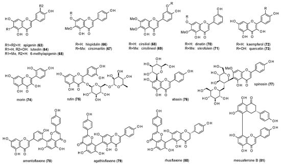 Another very common flavonoid with GABA-inhibiting properties is luteolin (64), which was found to reduce stimulation of chloride currents to 66% of the control level at a concentration of 50 µM [62]. The IC50 value was calculated with 6.62 µM.