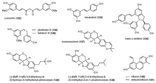 Due to the limited number of reports, isoflavones (including one isoflavane) and chalcones will be discussed in one subsection (Figure 6).