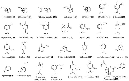 - Granger, R.E.; Campbell, E.L.; Johnston, G.A.R. (+)- and (−)-borneol: Efficacious positive modulators of GABA action at human recombinant α1β2γ2L GABAA receptors. Biochem. Pharmacol. 2005, 69, 1101–1111. [Google Scholar] [CrossRef] [PubMed]