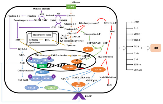 Signaling pathways involved in DR. eNOS, Endothelial nitric oxide synthase; ET-1, Endothelin-1; VEGF, Vascular endothelial growth factor; TGF-β1, Transforming growth factor beta; PAI-1, Plasminogen activator inhibitor-1; IL- Interleukin; TNF-α, Tumor necrosis factor alpha; VACM-1, Vascular cell adhesion molecules-1; DAG, Diacylglycerol; PKC, Protein kinase C; NF-κB, Nuclear factor kappa; ROS, Reactive oxygen species; MAPK, Mitogen-activated protein kinase; RAGE; Receptor for AGE; CDC42, Cell division control protein 42; UDP-GlcNAC, Uridine diphosphate N-acetylglucosamine; AR, Aldose reductase; TCA, Tricarboxylic acid; STAT1, Signal transducer and activator of transcription 1; IRF-1; Interferon regulated factor 1; PARP; Poly (ADP-ribose) polymerase; GLUT, Glucose transporter; RAS, Renin-angiotensin system.