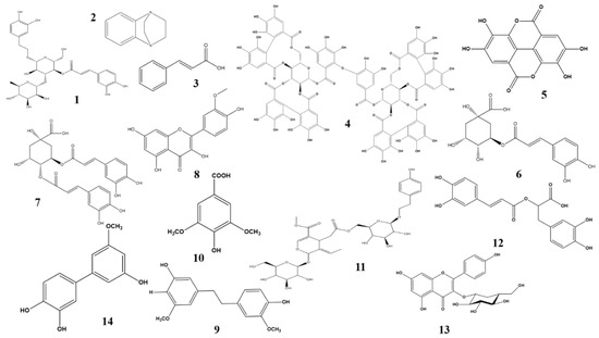 1. Acetoside—Abeliophyllum distichum; 2. benzo[b]-1,4-diazabicyclo[2.2.2]octane—Aegle marmelos; 3. Cinnamic acid—Aegle marmelos; 4. Agrimoniin—Agrimonia pilosa; 5. Ellagic acid—Carpobrotus edulis; 6. Chlorogenic acid—Aster Koraiensis; 7. 3,5-dicaffeoylquinic acid—Aster koraiensis; 8. Isorhamnetin—Cochlospermum religiosum; 9. Gigantol—Dendrobium chrysotoxum; 10. Syringic acid—Dendrobium chrysotoxum; 11. Specnuezhenide—Ligustrum lucidum; 12. Rosmarinic acid—Melissa officinalis; 13. Astragalin—Moringa oleifera; 14. 5′-methoxybiphenyl-3,4,3′-triol—Osteomeles schwerinae.