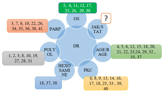 ROS, PKC activation, AGEs production, hexosamine flux, PARP activation, and MAPK activation are interlinked to each other, and are the main causative agents in the pathogenesis of DR. Inhibition of the mechanisms described above can prevent the apoptosis of retinal cells in diabetes, and ultimately delay and ameliorate DR as shown in Figure 1.