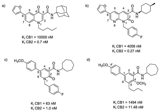 - Pasquini, S.; De Rosa, M.; Pedani, V.; Mugnaini, C.; Guida, F.; Luongo, L.; De Chiaro, M.; Maione, S.; Dragoni, S.; Frosini, M.; et al. Investigations on the 4-quinolone-3-carboxylic acid motif. 4. Identification of new potent and selective ligands for the cannabinoid type 2 receptor with diverse substitution patterns and antihyperalgesic effects in mice. J. Med. Chem. 2011, 54, 5444–5453. [Google Scholar] [CrossRef] [PubMed]