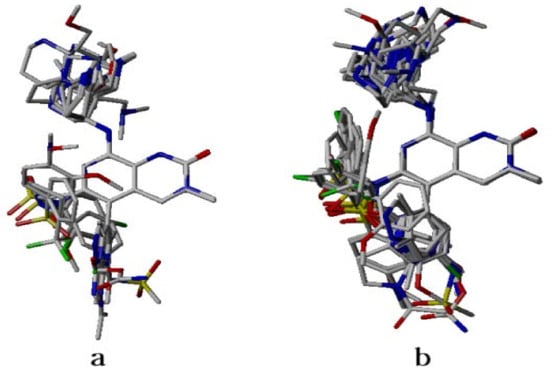 The 3D structures of the inhibitors were sketched in the SYBYL-X 2.1.1 molecular modeling package. The omega tool from OpenEye Scientific Software [30] was used for conformational search of each molecule. Finally, the lowest energy conformer was selected from all the resulting structural conformations. The partial charges were calculated using different methods including GH, GM, and MMFF94 charges [31,32]. Because the alignment of molecules is believed to be the most crucial and important requirement for a 3D-QSAR model’s robustness and predictability, the alignments were performed based on common substructures of the template molecule and all the other compounds present in the dataset. Due to the highest inhibitory activity, compound 42 was considered to be a template molecule. For ligand-based modeling, alignment was obtained after superposition of the lowest energy conformation of each molecule obtained from the omega tool on the compound 42. However, for structure-based modeling, the alignment was performed on the conformations obtained after the molecular docking simulations.