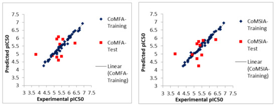 Experimental vs predicted biological activities (pIC50) values from best structure-based three-dimensional quantitative structure activity relationship (3D-QSAR) models.
