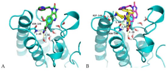 Docking pose of the ligands in the active site of the BRD4 protein (cyan) along with water molecules (red and white sticks). (A) Superposition of best pose of the co-crystal ligand (green) on the bound ligand (magenta) after redocking experiments; (B) Superposition of the docked pose of the most active compound (yellow) on the co-crystal ligand (magenta). The yellow dotted lines represent hydrogen bonds.