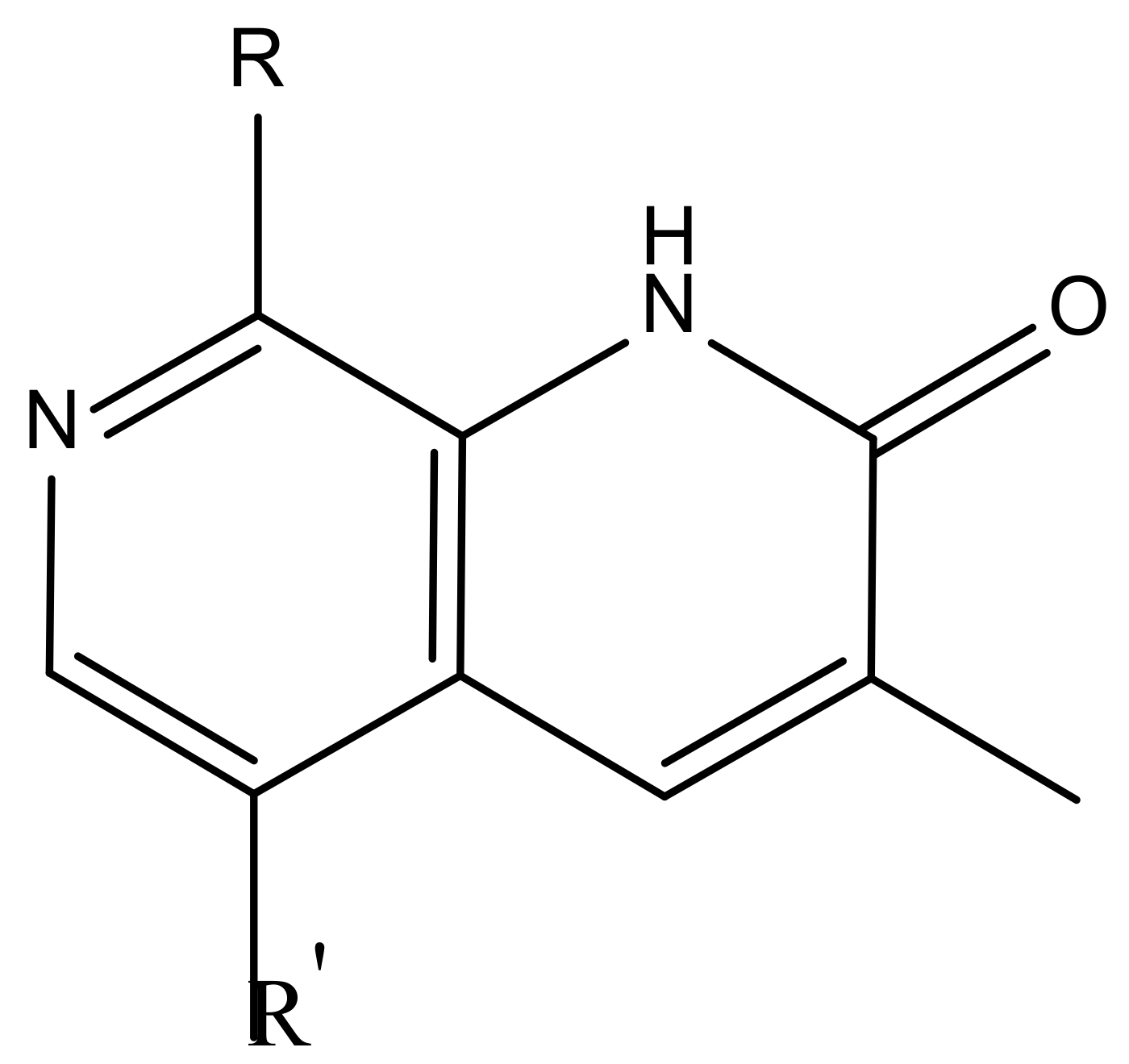 In electrostatic contours, as shown in Figure 3b, the presence of the large blue contour near the R3 position of 3-methyl-1,7-naphthyridin-2(1H)-one suggests that electron-donating groups will likely enhance the biological activity of the designed compounds. Compounds 55, 57–59, which have pyridine rings with different electron-donating substituent groups, are more active than compounds 51, 54, 56, and 60 possessing only heterocyclic rings. Similarly, the large red contour near the R2 position suggests that an electron-withdrawing group is desirable for improving the activity. Therefore, compounds such as 14, 15, 28, and 30 are less active than 22 and 34 because they have an electron-donating group near the R2 position.