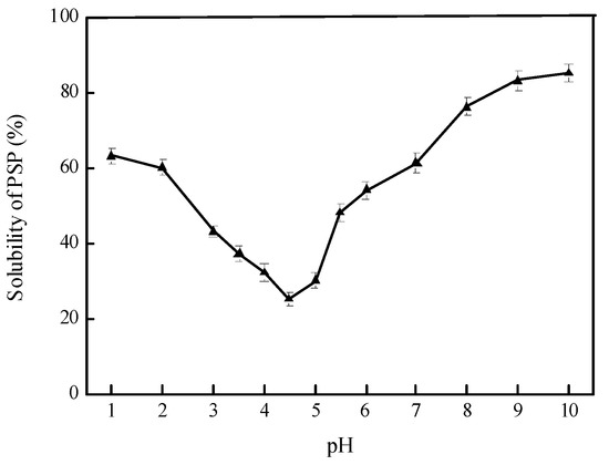 Protein solubility of PSP was measured by dispersing the PSP samples in deionized water to acquire a final solution of 0.2 wt % in protein. The pH of the PSP dispersion was adjusted from 10.0 to 1.0 and then it was centrifuged at 12,000× g for 30 min (25 °C). The content of protein for the resultant dispersion was determined by the Lowry method [23].