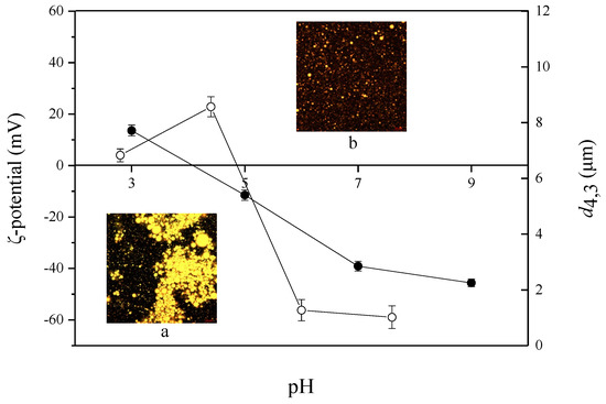 Influence of pH on ζ-potential (●) and d4,3 (○) of PSP-stabilized emulsions. Insets show the confocal laser scanning microscopy (CLSM) microstructures at (a) pH 5.0, (b) pH 7.0. Scale bar in the micrographs corresponds to 10 μm. Values are means ± SDs (n = 3).