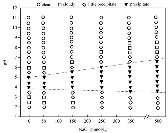 Salt is a common ingredient in many food emulsions, such as milk, butter, cream, soups, margarine, sauces and mayonnaise [20]. Figure 3 is the effect of NaCl concentration and pH on the phase behavior of PSP dispersions. It can be observed that with the increase of NaCl concentration, phase separation (precipitate) occurred in these dispersions. Moreover, this phase separation region became wider and shifted towards high pH values and the stability of the system decreased. This was due to the screening effect of NaCl, as the electrostatic repulsion between proteins in the dispersions could be weakened and this effect would aggravate with the increase of NaCl concentration.