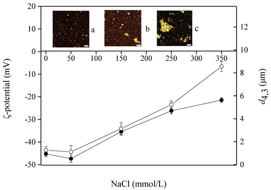 Influence of salt concentration on ζ-potential (●) and d4,3 (○) of PSP-stabilized emulsions. Insets show the CLSM microstructures at (a) 50 mmol/L NaCl, (b) 150 mmol/L NaCl and (c) 250 mmol/L NaCl. Scale bar in the micrographs corresponds to 10 μm. Values are means ± SDs (n = 3).