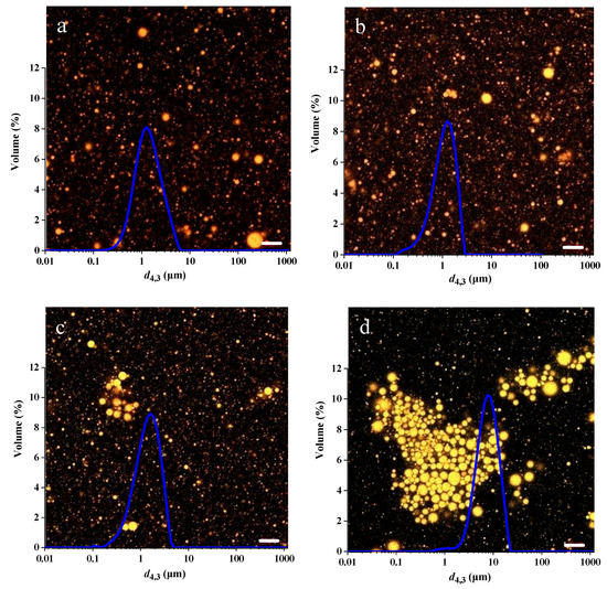 At 90 °C thermal treatment, the d4,3 of the emulsion was measured as 11.43 μm and extensive droplet aggregation can be observed in Figure 6d. A possible explanation for this phenomenon is that thermal denaturation of the adsorbed proteins [18]. Thermal denaturation and unfolding of adsorbed proteins on the droplet surfaces would result in the exposure of non-polar and sulfhydryl groups, thus increasing protein-protein interactions and causing droplet aggregation [10].