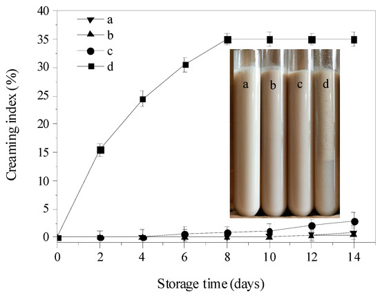 Figure 7 represents the influence of thermal treatment on the creaming index (CI) and creaming stability of different emulsions after 2 weeks storage. As time extended, emulsions a–c showed good storage stability and no clear phase separation was observed. However, for the emulsion treated at 90 °C (emulsion d), its creaming index gradually increased during storage and reached the maximum at the 8th day (35.12%). As illustrated, emulsion d exhibited a clear layer separation with an obvious boundary between the cream and serum layers. Figure 5 indicates the onset denaturation temperature of PSP was at 83.12 °C. Therefore, a poor stability was observed in emulsion d because the PSP had denatured at 90 °C thermal treatment.