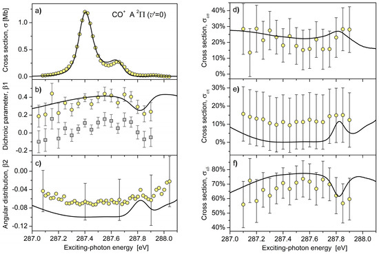 Comparison between the theory (solid curves) and experiment (open circles). Panel (a): cross section for the population of the CO+ A 2Π (v′ = 0) vibronic state in the vicinity of the C*O (1s→π*) resonance (data from Reference [14]). Panels (b,c): dichroic parameter β1 (present calculations and measurements) and angular distribution parameter β2 (data from Reference [14]) for the A 2Π (v′ = 0) → X 2Σ+ (v″ = 0) fluorescence band of the CO+ ion emitted after Auger decay of the C*O (1s→π*) resonance. The open squares in panel b) illustrate uncorrected data, while β1 values shown by open circles account for different transmissions of the circularly polarized fluorescence (see Section 3.3 for details). Panels (d–f): Relative partial photoionization cross sections (in percent from the total cross section shown in panel (a)) for the emission of three partial electron waves εσ, επ, and εδ, resulting in the population of the CO+ A 2Π (v′ = 0) vibronic state (obtained via Equation (3) by combining the present data for β1 and data from Reference [14] for β2).