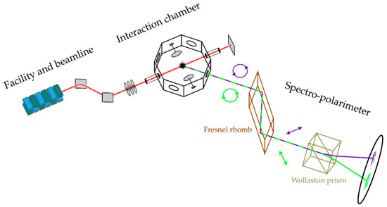 An overview of the experimental set-up illustrating the experimental geometry, design of the interaction chamber and spectro-polarimeter with details of the polarization analysis (see text).