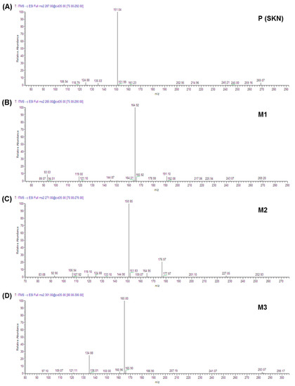 | M4 | [M − H]− 461.52 | 285.27 (100) | Either SKN-5-O-β-glucuronide or SKN-4′-O-β-glucuronide b |