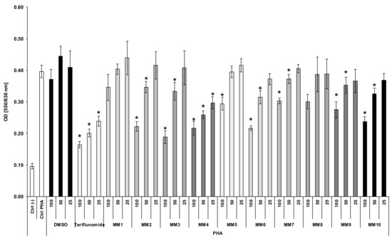 The results showed that the compounds exhibited differential abilities to suppress phytohemagglutinin A (PHA)-induced lymphocyte proliferation (Figure 2). The most suppressive was MM3, as in the case of concanavalin-induced splenocyte proliferation (Supplementary Materials, Figure S3). Its inhibitory action, in terms of kinetics, resembled that of teriflunomide but was somewhat weaker.