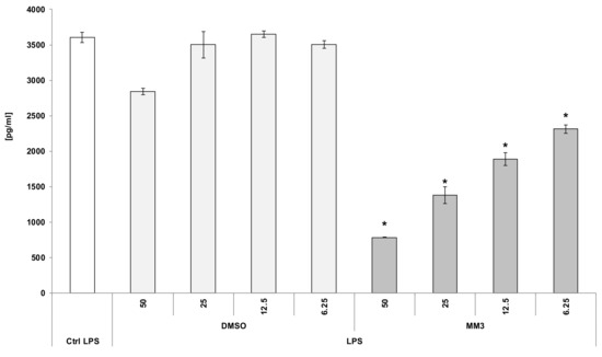 Effect of MM3 compound on lipopolysaccharide (LPS)-induced tumor necrosis factor (TNF α) production in whole blood culture. * p < 0.05 versus appropriate dilutions of the solvent (DMSO).