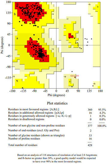 - Laskowski, R.A.; MacArthur, M.W.; Moss, D.S.; Thornton, J.M. PROCHECK: A program to check the stereochemical quality of protein structures. J. Appl. Crystallogr. 1993, 26, 283–291. [Google Scholar] [CrossRef]